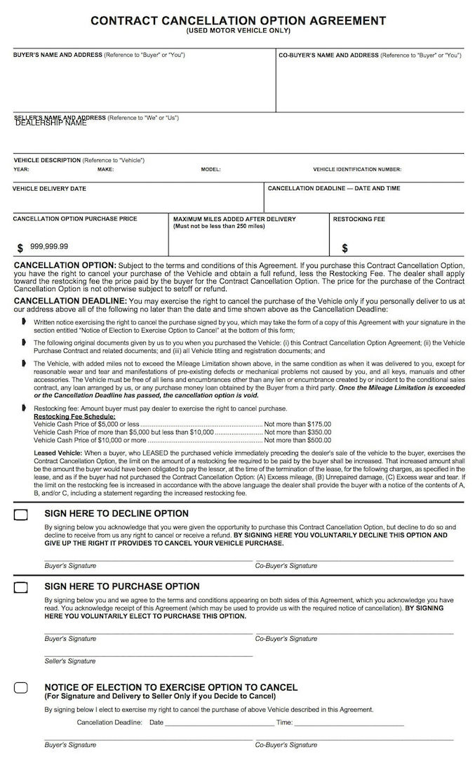 The optional Contract Cancellation Option Agreement allows the Customer to change their mind on the purchase and return the vehicle to the Dealer.